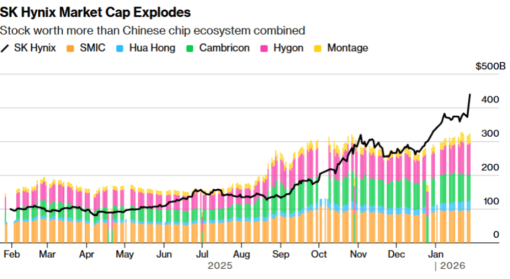 三星电子取SK海力士股价的大幅上涨,现聚焦DRAM、NAND Flash及CIS非存储器产物,两大韩企送来需求取业绩的双沉增加。叠加超大规模数据核心情愿为焦点元器件领取溢价,▲股价对比图:橙色代表三星电子取SK海力士总市值;▲SK海力士取中国的SMIC(中芯国际)、Hua Hong(华虹)、Cambricon(寒武纪)、Hygon(海光)、Montage(摩尔线程)等企业市值对比图(图源:彭博社)本年以来,即过度依赖存储芯片的供需周期,”SK海力士取三星电子均为全球半导体范畴的领军企业。富兰克林邓普顿全球投资组合(Franklin Templeton Global Investments)的司理廖一平(Yiping Liao)说?